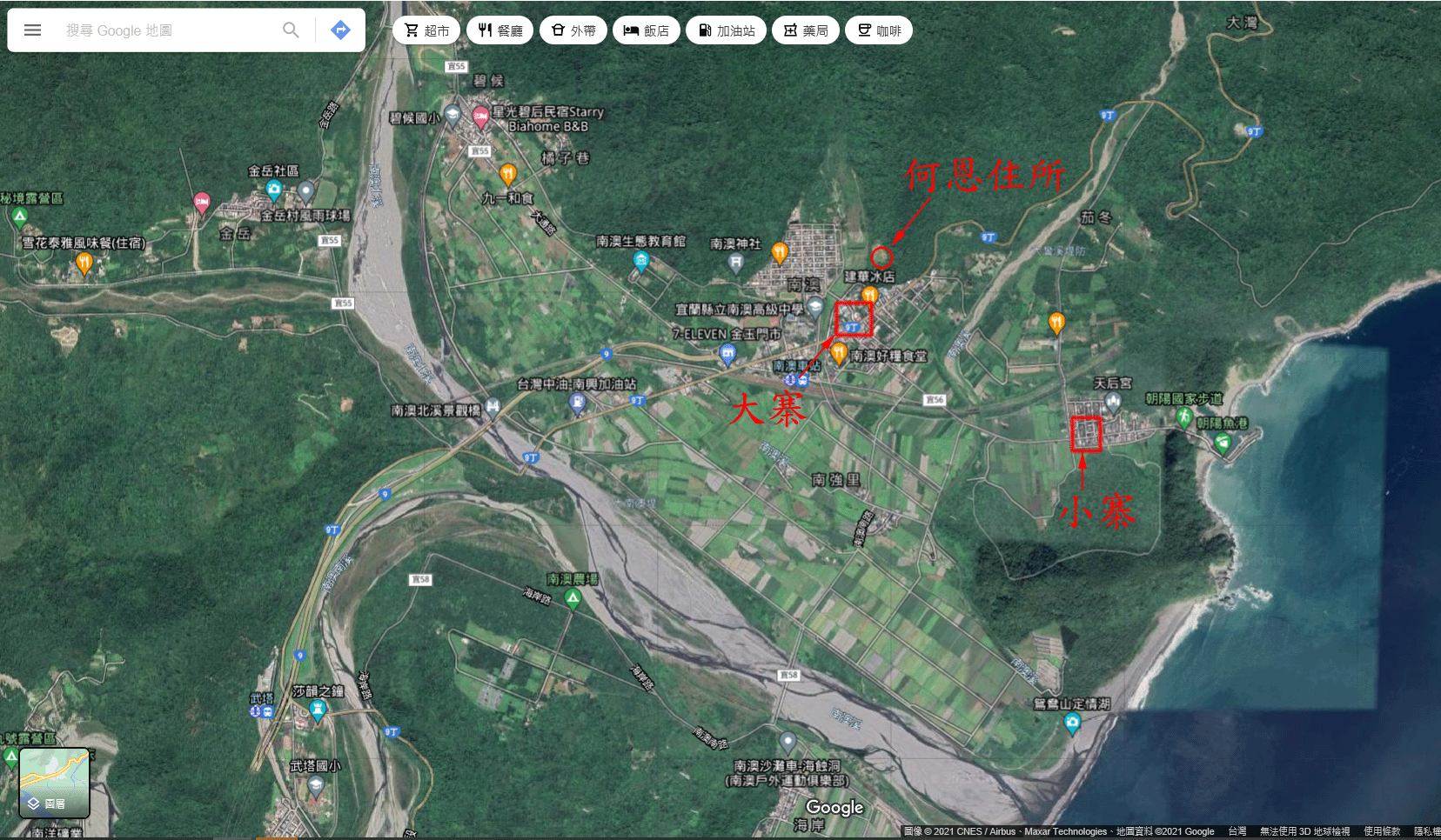 何恩自己則住在附近的山上, 有一條小溪流過, 這小溪我猜很可能就是南澳溪的支流武雲溪(不過文獻上寫的是小溪, 而武雲溪卻很大, 這地點有存疑)。