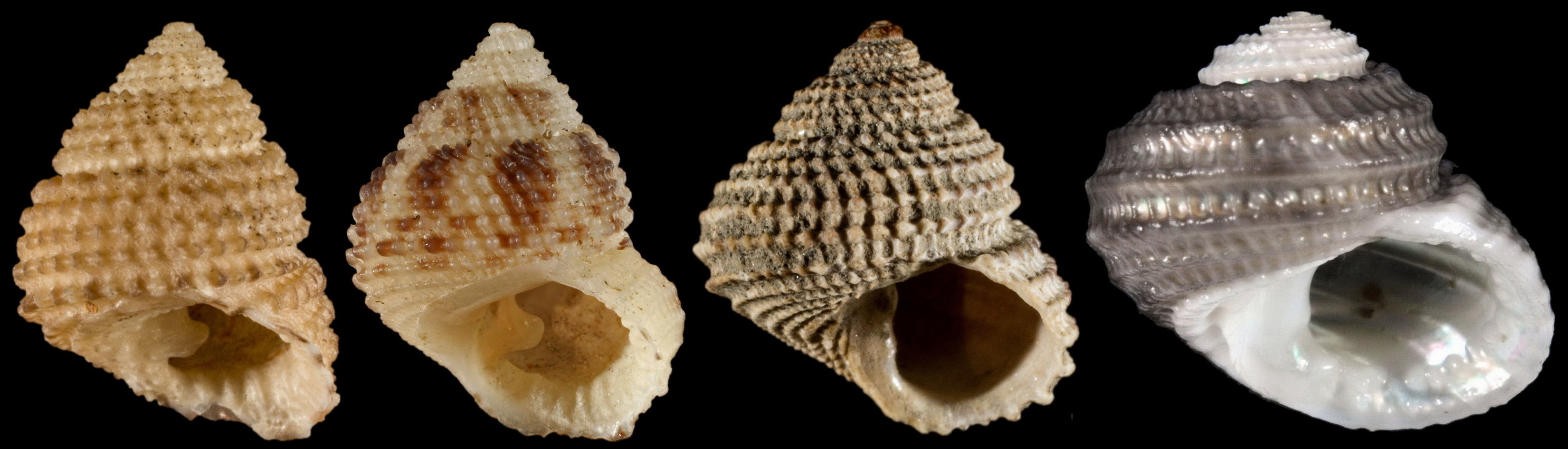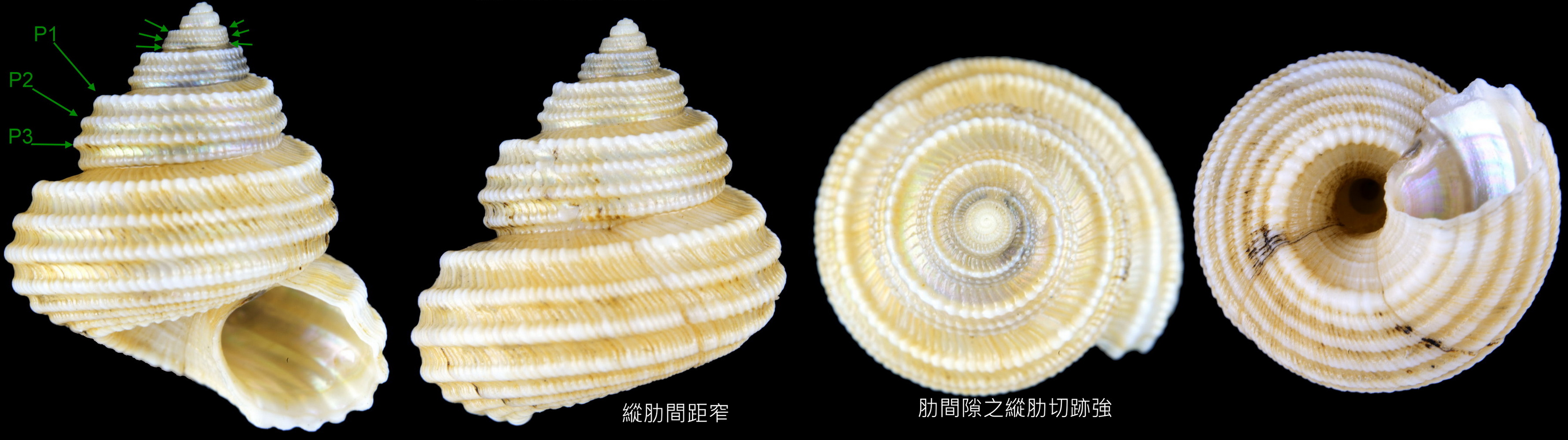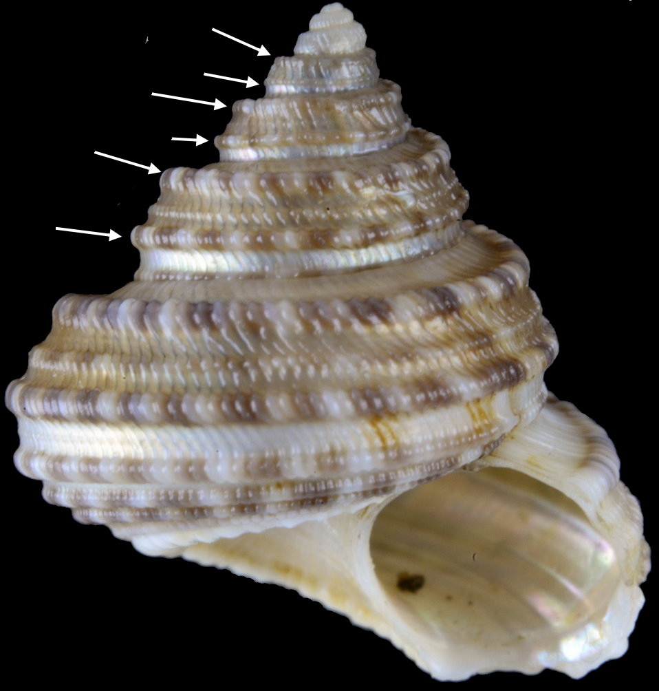 Chilodontaidae雕鐘螺這一科,有幾個屬,環肋的發生與分生有一個特性,就是會不特定地產生次生肋,次生肋的位置,數量與厚度都不一致,造成物種辨識下的困難.