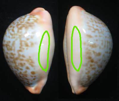 請問一下各位先進 我曾聽一位南部資深貝商說 柔姬寶螺的兩側(如圖示綠色部分)會翹起來(稍微有點像黑獵帽那樣) 是真的嗎 |