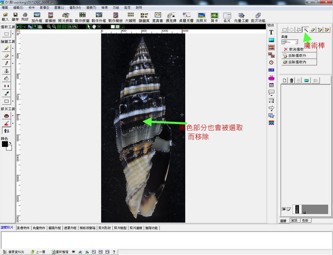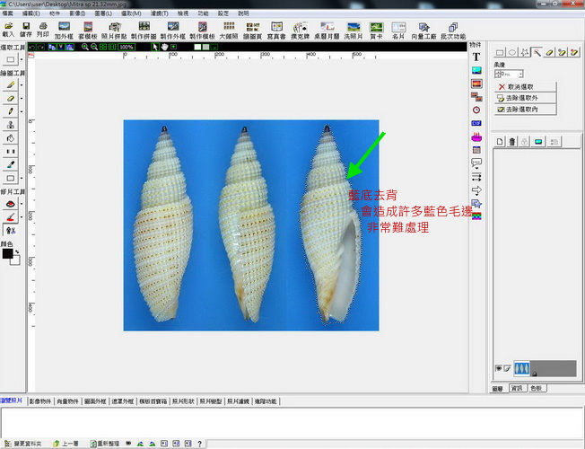 藍色的背景,會增加去背的複雜性,極難處理,若將這隻筆螺以黑色背景去背時,漂亮的殼胚會融入背景,也跟著被去除.
