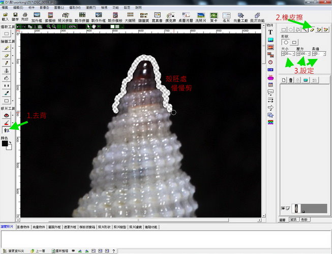 我設定用: 大小20 壓力100% 柔邊0 ( 貝殼去背柔邊一定要用0 )