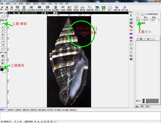 工具改用筆刷, 顏色選黑色,將貝殼外深黑背景中所有的雜點塗成黑色, 再另存新檔成jpg檔