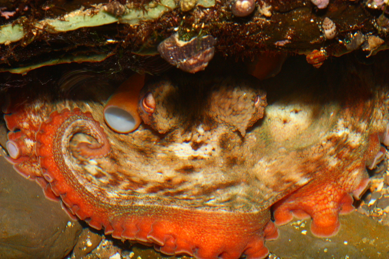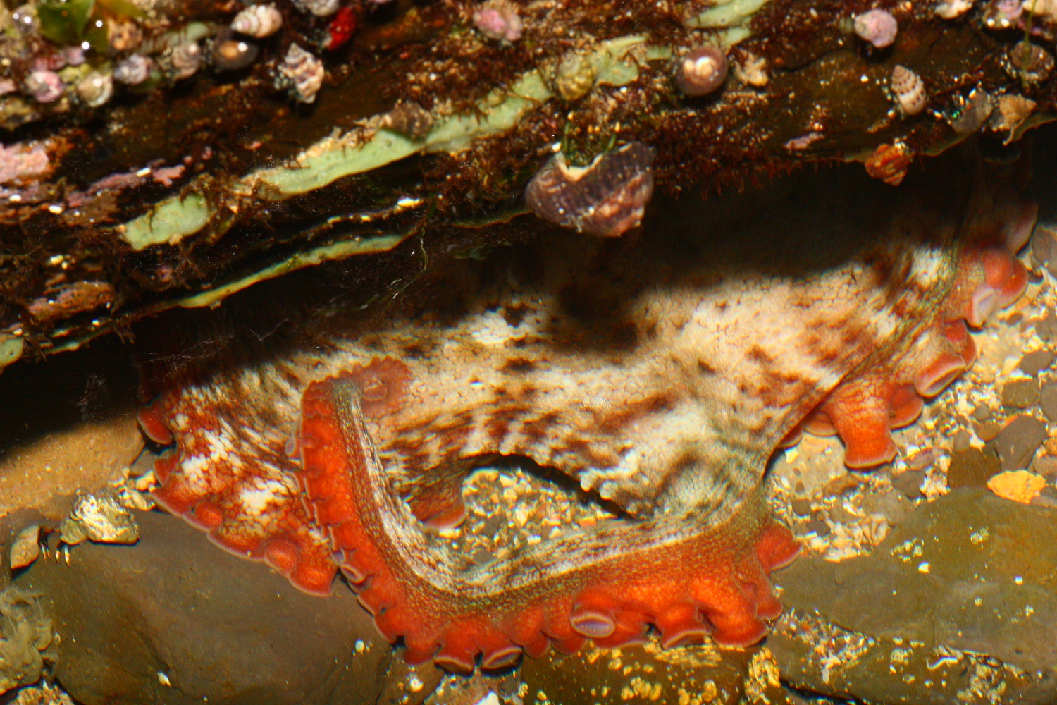 章魚一隻, 看到我, 就慢慢溜進洞裡