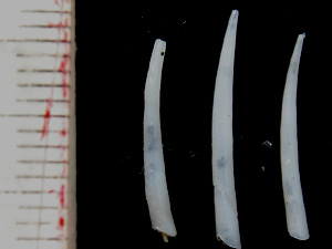 這是另一種象牙貝,長約15mm,比較粗,不透明,底部沒有斜一邊,縱肋較明顯(拍不太出來.),應該和之前那種不一樣.