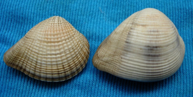 右一是唱片簾蛤〈Circe scripta Linnaeus,1758.〉。左一、右一澎湖很多,市場活貝論斤賣。