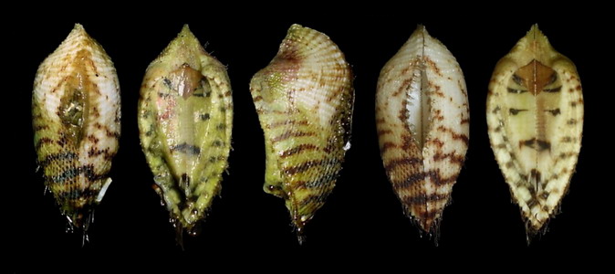 幾天前買的活體貝,只有26mm,超小而完整,非常可愛。今天將它清洗後,發現它的雙殼頂面,竟然合成一個阿拉伯男士的面孔圖樣,很逼真。請看下圖,前三張是活體,後二張清洗後。