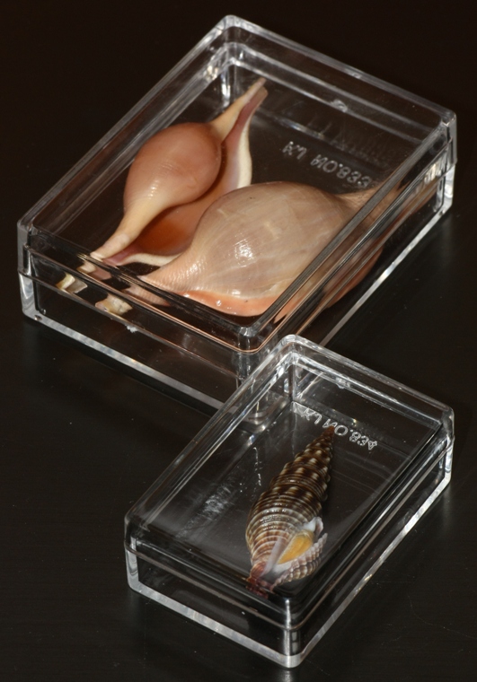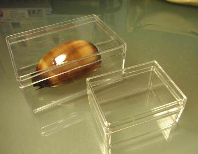 小的(KJ no.832):27mm*55mm*39mm,這種不是很確定出來多久,但是我最近在太原路發現到的,不是每家瓶瓶罐罐的店都有賣這種型號,特定幾家才有(ex.于正膠業),這種很好用,很多16號擺不下,牙籤盒最小號又嫌太浪費空間的中小型貝殼,832就適用在這種尷尬size的場合,太原路單價15。備註:國外還有一種比這大一點的(大都用來裝小朋友玩的小模型車),也是很好用,柯大哥之前有引進一批(好像是擺優美寶螺的樣子,記錯請糾正),洋貨價位不便宜,90一個
