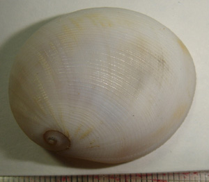 此殼的背面有很多細螺肋,略有棕色塊斑.